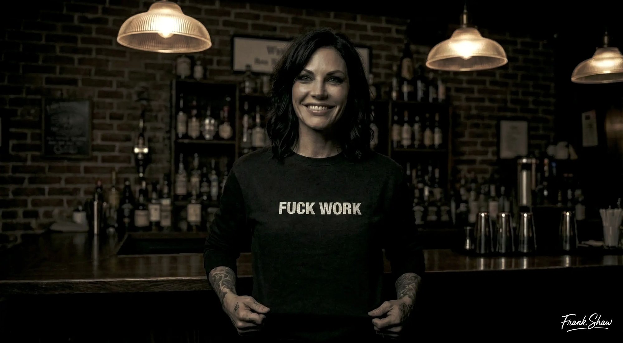 Whether you wear it behind a bar, on stage, or just grabbing gas station coffee at 3pm, this thing starts conversations. Big, bold print. No explanation needed.